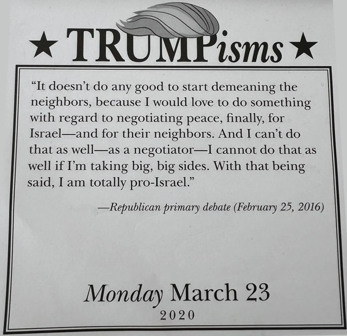 The quote for that day was taken from a Trump speech at a Republican primary debate on 25 February 2016. When referring to negotiating peace in the Middle East, he said “It doesn’t do any good to start demeaning the neighbours, because I would love to do something with regard to negotiating peace, finally, for Israel – and for their neighbours. I cannot do that [be a negotiator] as well if I’m taking big, big sides. With that being said, I am totally pro-Israel.”